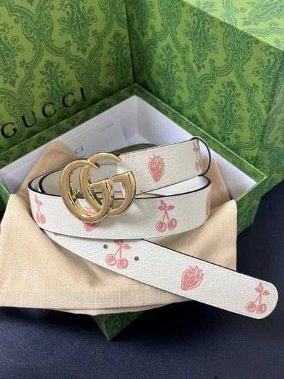 2025 Spring/Summer Collection. The brand's iconic GG diamond logo is reinterpreted, and the strawberry and cherry print beige imported cowhide is presented in a dazzling tone on this women's belt, 3.0 width. DDD