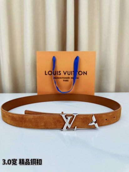 3.0 wide pretty LV belt, showcasing the brand's exquisite craftsmanship, features a luminous metal LV Initiales buckle that echoes the incomplete Monogram flower at the end. The suede leather provides a trendy choice for the autumn/winter season.