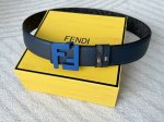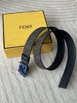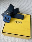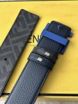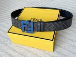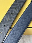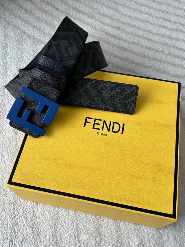 Fendi Men's Casual Reversible Waistband (4.0cm), same style as in Fendi boutiques. One side is navy blue pebbled leather, the other side features a smoke gray and black Ff pattern paired with Ff's classic design and a painted blue metal snap buckle. Stylish, casual, and versatile.