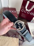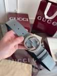 This eye-catching men's belt from Gucci's 2026 Early Spring collection features a buckle with a pin that allows for easy flipping and interlocking of the double-G shaped hardware. One side is made of black calfskin leather, and the other side is grey calfskin leather. It's 4cm wide and reversible. DDD