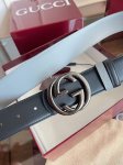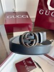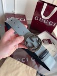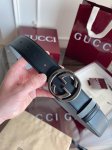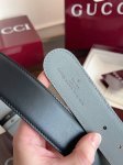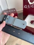 This eye-catching men's belt from Gucci's 2026 Early Spring collection features a buckle with a pin that allows for easy flipping and interlocking of the double-G shaped hardware. One side is made of black calfskin leather, and the other side is grey calfskin leather. It's 4cm wide and reversible. DDD