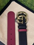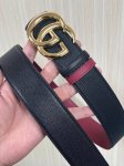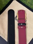 This eye-catching new men's belt is part of the 2026 Early Spring collection. The belt buckle features a pin for easy flipping and interlocking double-G shaped hardware. The ruthenium-toned finish provides a shimmering effect, adding a unique charm to the overall design. One side is black leather, while the other features a 4.0-inch wide burgundy leather buckle.