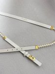 This season's new iconic Dior Caro beaded belt is meticulously crafted from white glass beads and smooth, cream-colored calfskin, creating a distinctive look. Adorned with the iconic "Cd" buckle in a lustrous gold-plated steel clasp, it can be paired with classic blazers, dresses, or jeans for an elegant touch. White glass beads, 30 Montaigne "Cd" buckle, "Christian Dior Paris" logo on the inside, lustrous gold-plated metal details, white and black imported calfskin DDD