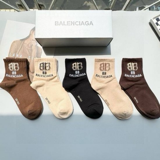 A box of five Balenciaga socks, including packaging. High-quality and incredibly stylish mid-calf socks from this top European and American brand, perfect for men and women. A must-have for trendsetters! These are high-quality mid-calf socks, sourced directly from the boutique. They create a super sophisticated and fashionable look! Highly recommended! A must-have fashion item!