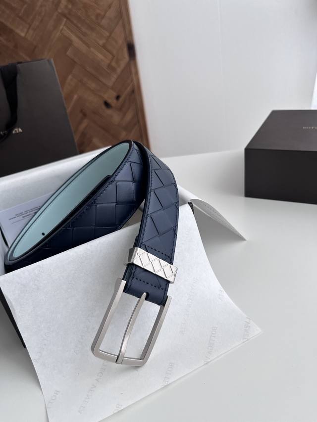 Bv new men's braided belt, handmade Intreccio large plaid woven double-sided Italian calfskin with a slightly vintage silver pin buckle. The buckle has a logo on the side and is a woven plaid design. Width: 35mm. Color: dark blue and light blue
