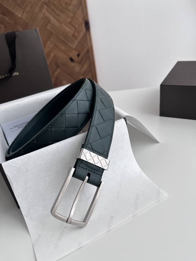 Bv new men's braided belt, pure handmade Intreccio large plaid woven double-sided Italian calfskin with a slightly vintage silver pin buckle with a logo on the side. The buckle is a woven plaid design. Width 35mm. Color: Pine Cypress Green.