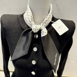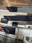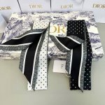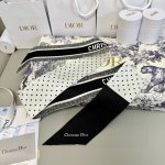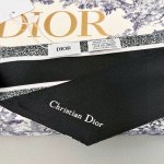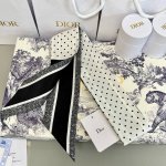 Dior Twilly silk scarf, polka dot black, classic style, slender shape, pointed ends, and contrasting Christian Dior signature stripe pattern on the back. It looks amazing on the body! It looks perfect with any outfit! The ribbon has super versatile uses: scarf, headband, bag accessory, belt...etc. It is perfect with clothes in summer and bags in winter. The top-grade silk has a super lustrous and exquisite appearance. This one is a must-have.