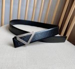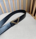 Prada's latest collection. This belt is crafted from exquisite glossy embossed leather, showcasing simple, refined elegance. The minimalist metal buckle, embellished with a sculpted logo, creates a striking brand identity. 3.5" wide