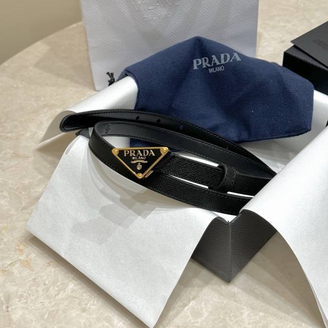 This elegant Saffiano belt highlights its feminine design, soft and charming, the triangular metal logo decoration reveals the brand atmosphere, metal buckle, carved belt loop with painted triangular metal decoration