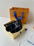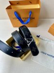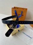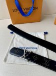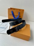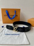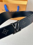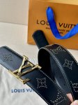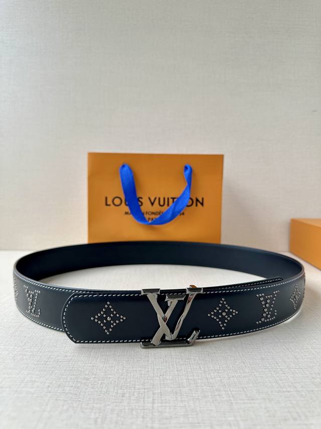This Lv belt, size 4.0 wide, is made of smooth leather and is decorated with studs that form the monogram of the house. It features Lv size loops with an aged effect and visible seams along the edges. These details give the model a sophisticated Western accent without changing its timeless and universal appeal