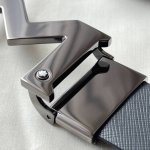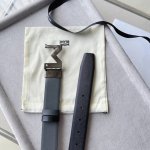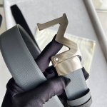 Palladium-plated "M" pattern buckle. Adjustable length, 3.5cm x 120cm, double-sided grey grained and black grained strap for a sporty look.
