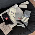 Box of four Thom Browne mid-calf socks (including packaging). A super popular trend on Tb.com, featuring the classic three stripes and a puppy design. Highly recommended by Instagram celebrities and influencers. Made of lightweight, soft, and breathable combed cotton, suitable for all seasons. A must-have for high-end European and American street style.