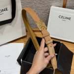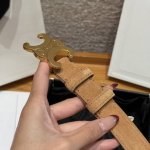 Celine Triomphe Medium Belt. This belt is made of suede cowhide leather with a split leather underlayer, gold-tone hardware, and a non-removable Triomphe buckle. Width: 25mm.