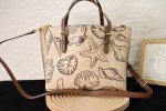 Coa*H Coach's new July model, Cbh63, features a beach shell print Mollie tote in the size 25. The starfish is a refreshing summer ocean motif, with a sandy yellow background. It can be carried by hand or across the body, size 25.