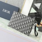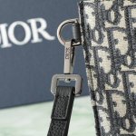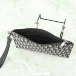 This A5 clutch is sleek and minimalist. Crafted from beige and black Oblique print fabric, it's detailed with black grained calfskin leather. The zippered compartment features a phone pocket and four card slots. Carry it by hand or stow it inside.