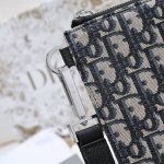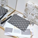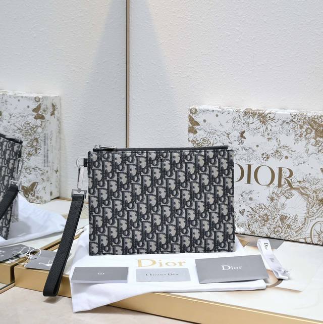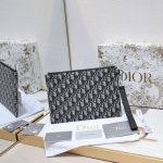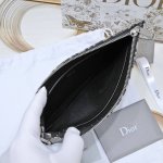This A5 clutch is an elegant accessory that showcases Dior's chic and exquisite craftsmanship. The front is decorated with the Dior logo, and the zippered compartment has a patch pocket for storing a card holder. It comes with a detachable leather strap and can be carried by hand or placed in the handbag.