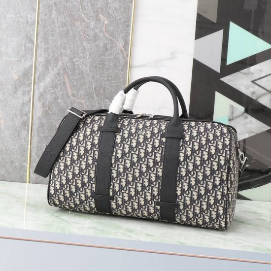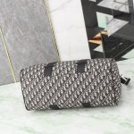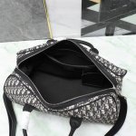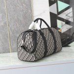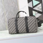 The Dior Oblique jacquard duffle bag is a stylish, oversized tote. The signature beige and black Dior Oblique jacquard pattern enhances the sleek, spacious silhouette. The black grained calfskin handles are embellished with a metal "Dior" logo on the front. The detachable, adjustable shoulder strap secures with a polished ring clip at the side. This spacious duffle bag is perfect for travel and everyday use.