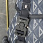 The Dior Hit The Road backpack blends modern style with the spirit of Dior's haute couture. Crafted from navy blue Cd Diamond canvas, inspired by the Dior archives, it's embellished with smooth calfskin leather details. It features two nylon jacquard straps with the Christian Dior signature, a main compartment, a front flap pocket, and two side flap pockets. This medium-sized design is practical and versatile, perfect for any casual look.