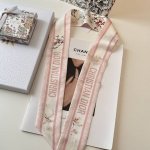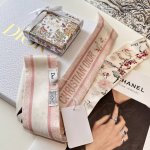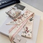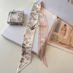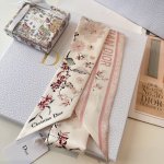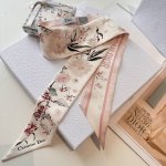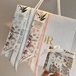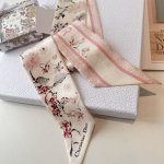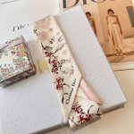 This Mitzah scarf features the Millefiori pattern, an Asian floral collection in soft and delicate tones for an elegant look. A classic, slim silhouette, it is crafted from ivory silk twill with a multi-color pattern and sharp corners. The back is decorated with a contrasting pink jacquard stripe pattern and the Christian Dior logo to enhance the style. It can be tied around the neck, wrist or handbag to add the finishing touch to any fashion look.