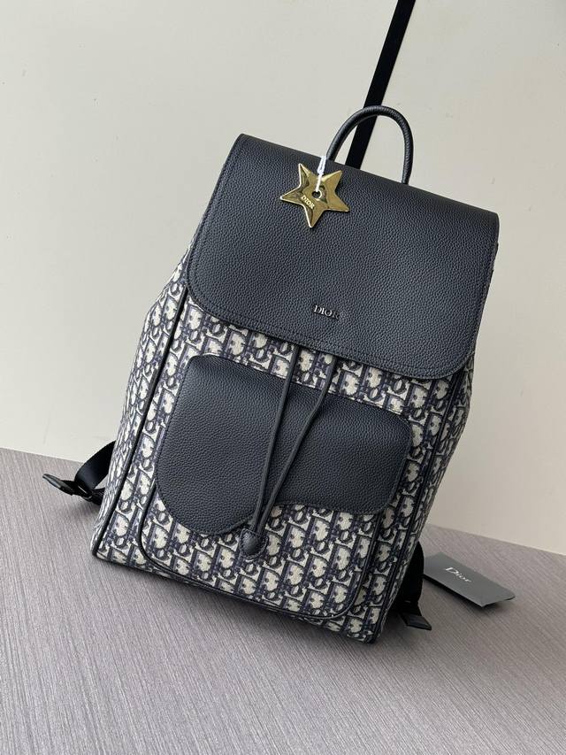 Top counter rat's hot item, the latest best-seller, the Dior Saddle Backpack. This stylish and original design evokes a saddle style. Crafted from beige and black Oblique print fabric, it's accented with black grained cowhide leather and embellished with the Dior signature on the front. Spacious, it features a compartment for everyday essentials, and a front flap saddle pocket for easy access, including a wallet, keys, headphones, or phone. This versatile and practical backpack complements any outfit.