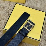 Full Packaging, Same Style as in Department Stores, 4.0cm Wide, Double Ring Reversible Belt, FF Snap Buckle, Black Cuoio Romano Leather Material, Reverse Fabric with Tobacco Yellow and Black FF Pattern, Square Metal Finish, Fashionable, Classic, and Versatile