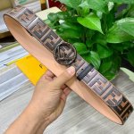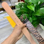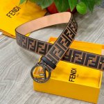 Fendl 40mm wide belt with logo design. Stud buckle. Made of brown calfskin. Embossed hand-painted black and brown Ff logo. Gold-plated metalwork for quality assurance.