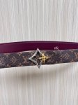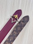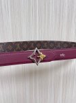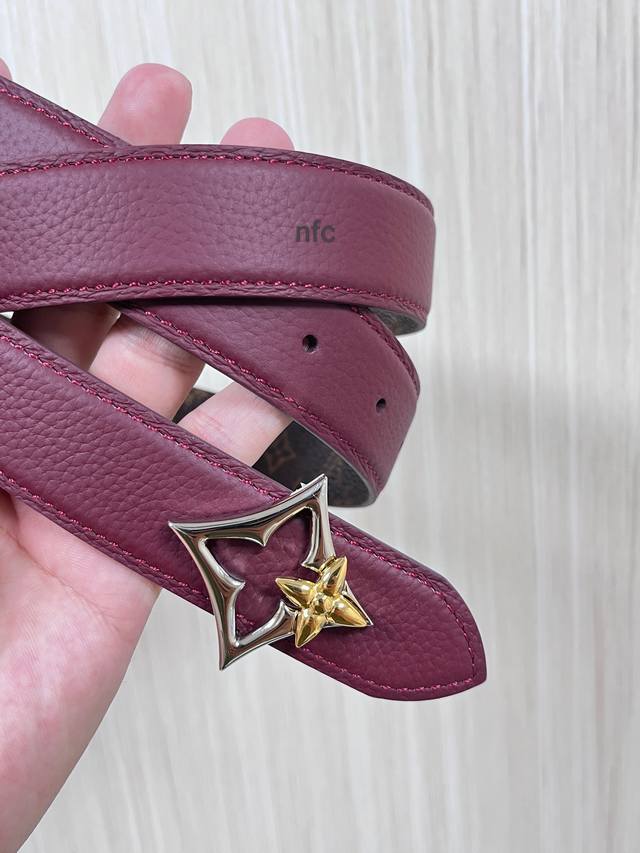 Flowergram Reversible Belt: This belt combines Monogram canvas and Monogram embossed leather for a dual-style look. A delicate, jewel-like buckle pays homage to the Monogram flower, adding an elegant touch to any outfit. 3.0 Burgundy Lychee Grain Double-Pointed Four-Heart Silver Buckle with Gold Flower (