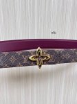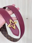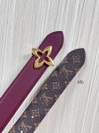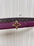Flowergram Reversible Belt: This belt combines Monogram canvas and Monogram embossed leather for a dual-style look. A delicate, jewel-like buckle pays homage to the Monogram flowers, adding an elegant touch to any outfit. 3.0 Burgundy lychee-patterned double-pointed four-leaf gold buckle.