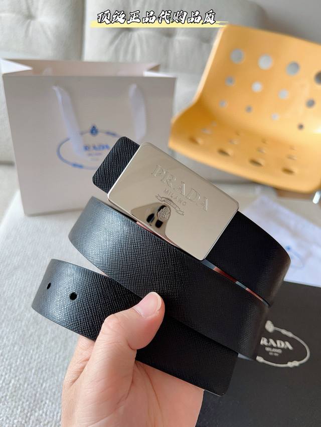 Guangzhou Factory P Direct Prada This versatile accessory features a simple yet sophisticated design. The elegant saffiano leather with cross-stripe lines adds a subtle touch of elegance. The iconic metal lettering logo and buckle closure create a stylish, casual, and versatile look. Belt Width: 35mm
