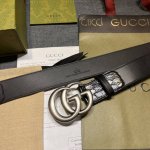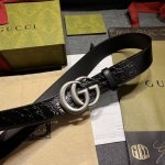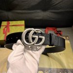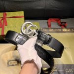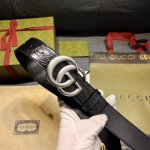 New Gucci, width 4.0 The iconic Gg pattern is perforated to add a sophisticated touch to this black leather belt. The Double G hardware in shiny palladium-tone metal is inspired by a 1970s archive design that is particularly meaningful to the brand.