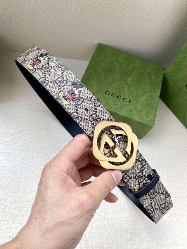 Width 4.0Cm Gucci Mickey Mouse pattern is one of Gucci's iconic elements, and it is reinterpreted in a cartoon style in this accessory. This belt combines classic Mickey elements and double G patterns, highlighting the brand's long-standing design heritage.