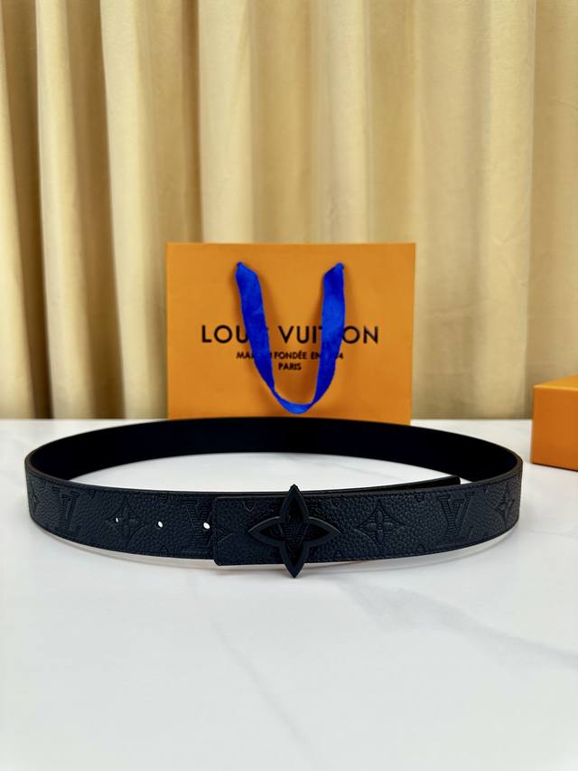 3.4mm wide Louis Vuitton classic black leather belt, featuring embossed details showcasing the brand's iconic elements and a four-leaf clover buckle, exuding luxury. The orange brand shopping bag and gift box complement each other, inheriting the Parisian fashion heritage of 1854, making it an ideal choice for showcasing refined taste.