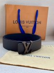 4.0 Wide Lv Taurillon Reversible Belt features two sides, one in grained Monogram embossed cowhide and the other in smooth cowhide. The brass buckle continues the leather's color, showcasing a dashing style within an elegant design. Taurillon cowhide leather and metal hardware. Made in Spain.