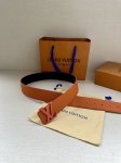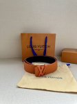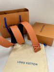 4.0 Wide Lv Taurillon Reversible Belt features two sides, one in grained Monogram embossed cowhide and the other in smooth cowhide. The brass buckle continues the leather's color, showcasing a dashing style within an elegant design. Taurillon cowhide leather and metal hardware. Made in Spain.