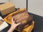 Magnetic buckle closure for easy access to the main compartment items, detachable leather handle and detachable and adjustable shoulder strap for hand, shoulder and crossbody.