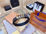Louis Vuitton Lv double-sided imported genuine leather belt features a two-tone design. The soft cowhide is hand-finished, one side black and the other brown. The reversible stainless steel buckle is durable and can be easily matched with gold or silver. The belt is 3.8cm wide and has an exceptionally flexible feel. This stylish and modern belt is a must-have for every successful man.