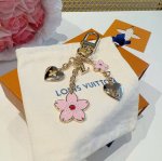 LV Keychain, Takashi Murakami Collaboration, Cherry Blossom Keychain Bag Charm Ddd. This chain bag charm is from the Louis Vuitton x Takashi Murakami reissue collection. The dazzling chain features an interlaced arrangement of Monogram flowers and Cherry Blossom enamel embellishments, subtly showcasing the collection's dynamic brushstrokes. The LV monogram adds another brand signature, and the spring clasps at both ends allow for various styling possibilities. DDD