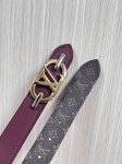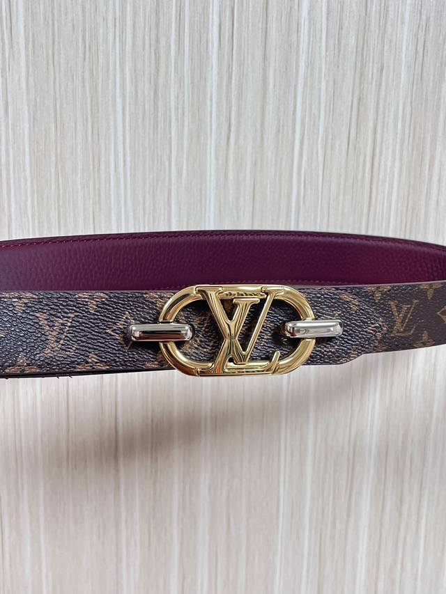 New for the season, this belt is crafted from luxurious calfskin and Monogram canvas, allowing for easy switching between two styles. The Louis Vuitton handwritten logo is transformed into a wide metal buckle, drawing attention to the center and adding an elegant touch to both casual and formal looks. Made of 3.0mm wide burgundy pebbled calfskin.