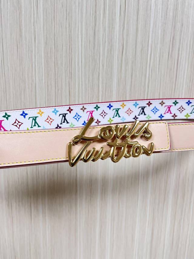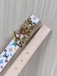 This season's newest design features a belt crafted from luxurious calfskin and Monogram canvas, allowing for effortless switching between two styles. The Louis Vuitton handwritten logo is transformed into a wide metal buckle, drawing attention to the center and adding an elegant touch to both casual and formal looks. Made of 3.0mm wide white calfskin.