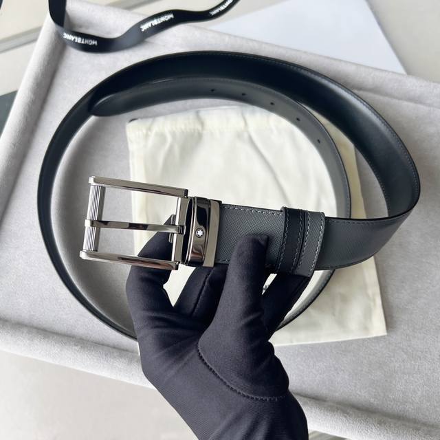 This reversible belt is a versatile companion, offering a unique combination of colors and textures. One side of the 35mm belt is crafted from gray grained leather, the other from shiny black leather, and fastened with a pin buckle emblazoned with the Montblanc six-pointed white star logo.