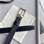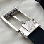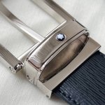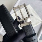 This reversible belt is a versatile companion, offering a unique combination of colors and textures. One side of the 35mm belt is crafted from blue grained leather, the other from shiny black leather, and fastened with a pin buckle emblazoned with the Montblanc six-pointed white star logo.