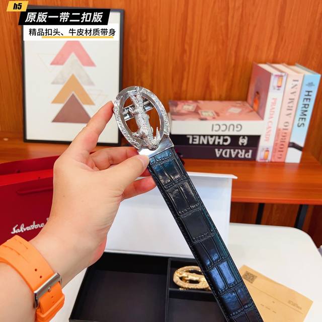 1 belt 1 buckle 1 belt 2 buckles Crocodile home slide double buckle version 1 belt 2 buckles genuine open mold This belt uses the original cowhide belt on both sides, precision electroplating iconic hardware buckle version counter. 3.8Cm If you need a wooden box 40