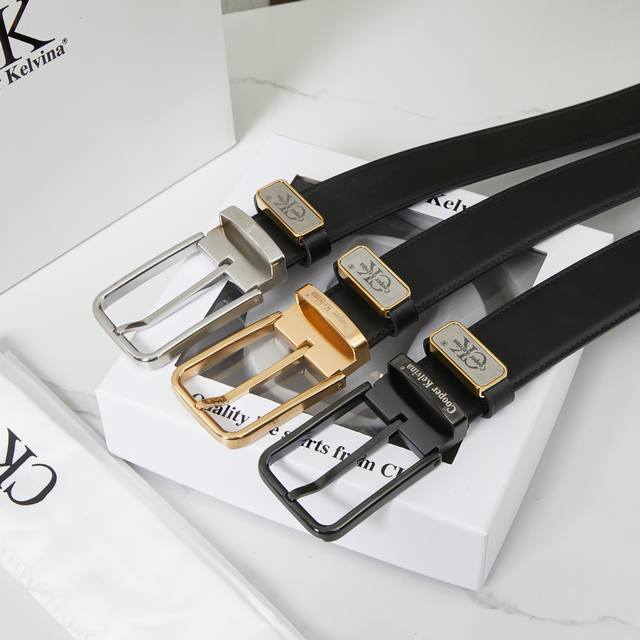 Belt: CK Top-Tier Replica. Single Buckle/Double Buckle. Belt: CK Trendy Brand. Authentic Product. Cooperkelvina Original Quality. 100% Imported Original Top-Grain Cowhide, Guaranteed Genuine Leather - CK Logo Pin Buckle Design. Vacuum Electroplating. Never Fades. 24K Pure Steel Buckle. Calfskin with Lychee Grain Texture. Black, Blue, Brown. Reversible. Authentic Product. Complete Trademark Certificates. Luxury Niche Brand. High-End Gift. Ideal for Personal Use. Passes Inspection. Packaging: Please look for the authentic product packaging shown in the picture. Includes a hole punch and UnionPay invoice. Width 3.5cm.
