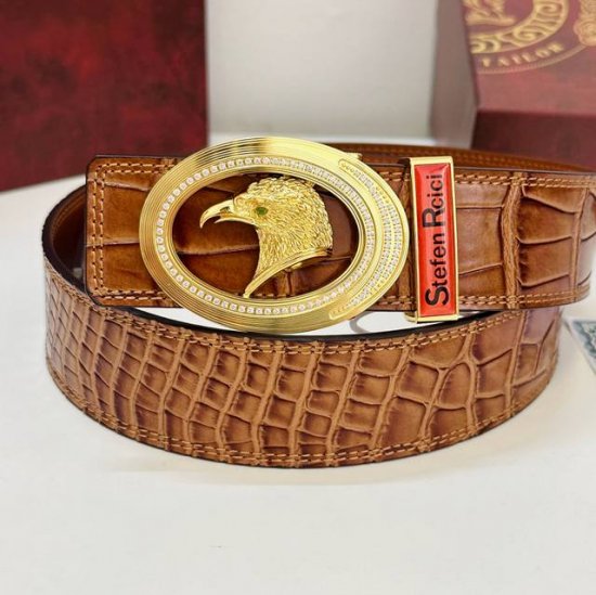 Belt: Stefen Rcici. Stefen Rcici Diamond-Studded Belt: Top-Tier Original Replica. Private Custom High-End Special Edition. Grade: Imported original top-grain crocodile leather texture - 24K pure steel material. Diamond-studded vacuum electroplating process. Stefen eagle head sapphire crystal design that will never fade. Private custom limited edition. Details: Stefen Rcici original export brand quality, 100% imported original top-grain cowhide, guaranteed genuine leather. Carved hollow diamond-studded process. Vacuum electroplating. Never fades. 24K pure steel buckle material, top-grain crocodile leather texture, double-sided reversible, same quality as the genuine product. The first choice for gifting or personal use. Packaging: All come with the complete set of gift box packaging shown in the picture, free hole punch, UnionPay invoice, width 4.0 cm.