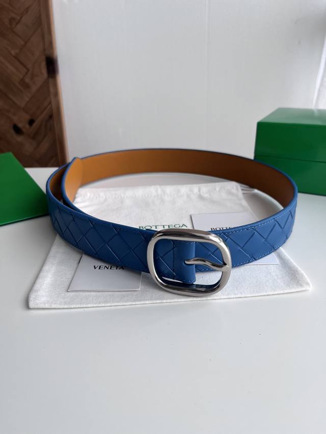 Bv 2025 Newest Men's Braided Belt, Handmade Intreccio Large Check Braided Double-Sided Italian Calfskin with Oval Slightly Retro Silver Buckle, Wide Body with Flat Hole Design, Pointed End, Side Marking, Belt Width 35mm, Colors: Surfing Blue, Gold, Brown