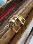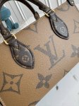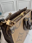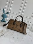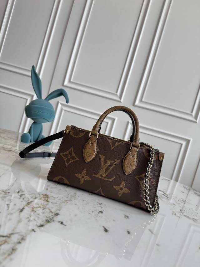 This Onthego East West bag features Monogram Giant elements in coated canvas, complemented by Monogram Reverse coated canvas trim and gleaming hardware for an elegant look. A handle, detachable chain, and removable and adjustable shoulder strap allow for versatile carrying options, while multiple compartments and pockets ensure organized storage of valuables.