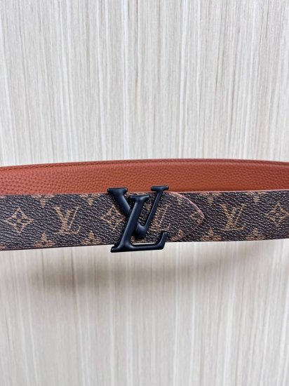 Flowergram Reversible Belt: This belt combines Monogram canvas and Monogram embossed leather for a dual-style look. A delicate, jewel-like buckle pays homage to the Monogram flower, adding an elegant touch to any outfit. 3.0 tan pebbled leather double-pointed classic black buckle.