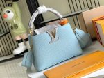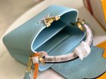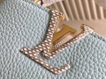 Premium quality with full packaging. Premium original leather M21167N80931. Haze blue with exotic snakeskin and gold buckle. Capucines Bb handbag. Imported from French calfskin, with gleaming metal hardware. The distinctive Capucines flap can be tucked inside to display the monogram logo or flipped out to reveal the Monogram Flower pattern. Size: 21 x 14 x 8 cm.