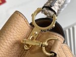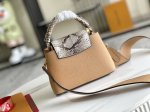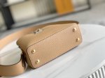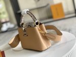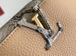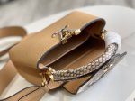 . Capucines Bb handbag. Imported French calfskin, shiny metal trim, and the distinctive Capucines flap can be tucked inside to display the monogram logo or flipped out to reveal the Monogram Flower pattern. Size: 21 x 14 x 8 cm.