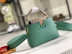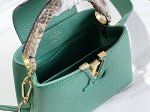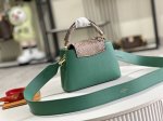 Capucines Bb handbag imported from France calfskin, shiny metal accessories, unique Capucines flap can be tucked inside to display the monogram logo, or flipped outside to show the Monogram Flower pattern.